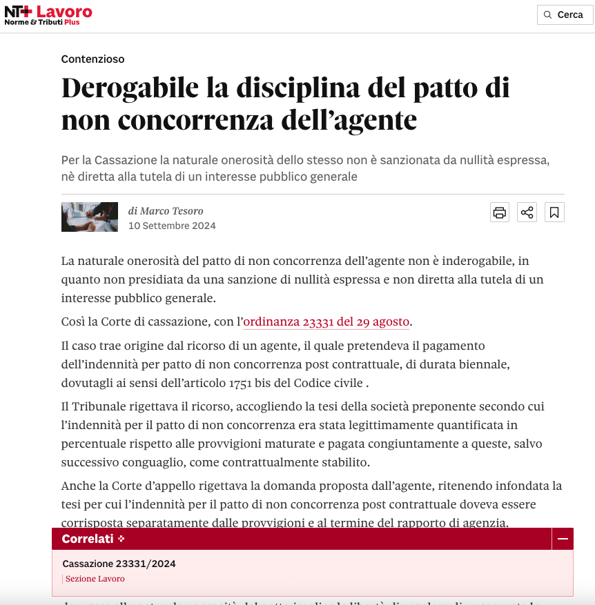 Derogabile la disciplina del patto di non concorrenza dell’agente