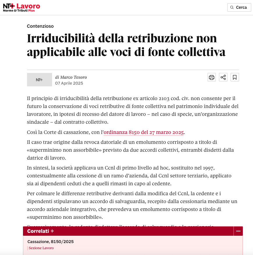 Irriducibilità della retribuzione non applicabile alle voci di fonte collettiva