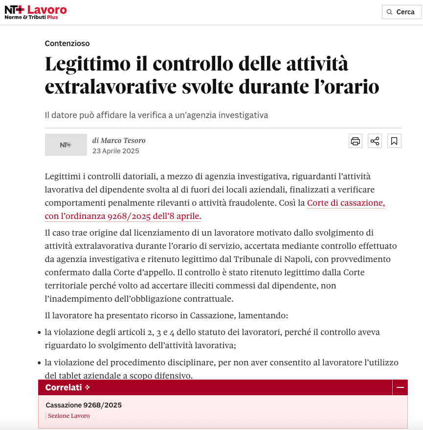 Legittimo il controllo delle attività extralavorative svolte durante l’orario