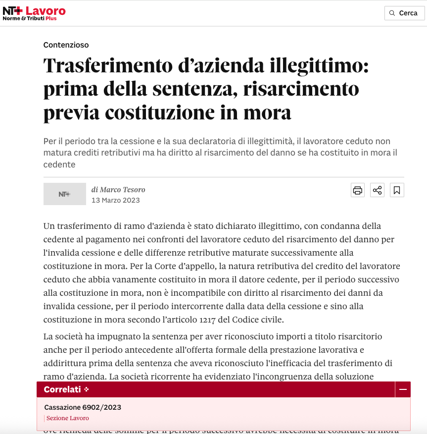 Trasferimento d’azienda illegittimo: prima della sentenza, risarcimento previa costituzione in mora
